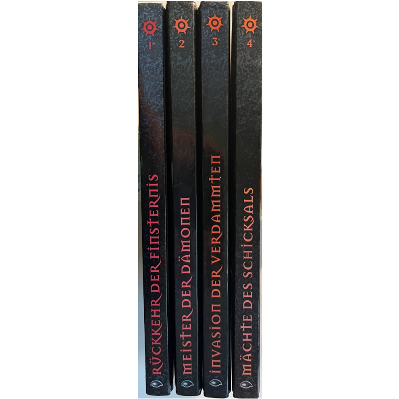 - Band 2 – Meister der Dämonen: Das Cover weist leichte Lagerungsspuren auf: vereinzelt kleine Kratzer und vorderseitig oben längerer schwacher Kratzer, Ecken rechts minimal gestaucht und winzigst angewetzt, vorderseitig Oberrand schwache kleine Delle – nur zu merken wenn mit dem Finger entlanggefahren wird, rechts am Rand vorder- und rückseitig kleine Kerbe, rückseitig am Oberrand beim Rücken kleinere Quetschung. Sonst keine Abplatzungen, Eckknicke oder -stauchungen und sehr schön satt farbfrisch und hochglänzend. Der Band selbst ist tadellos erhalten mit minimalen Gebrauchsspuren (erste Seite Aufkleber Vorbesitzerin, am Schnitt schwache Verfärbung vom Blättern, Seite 227 am Rand kleiner Einriß) – keine Markierungen, Eselsohren etc.