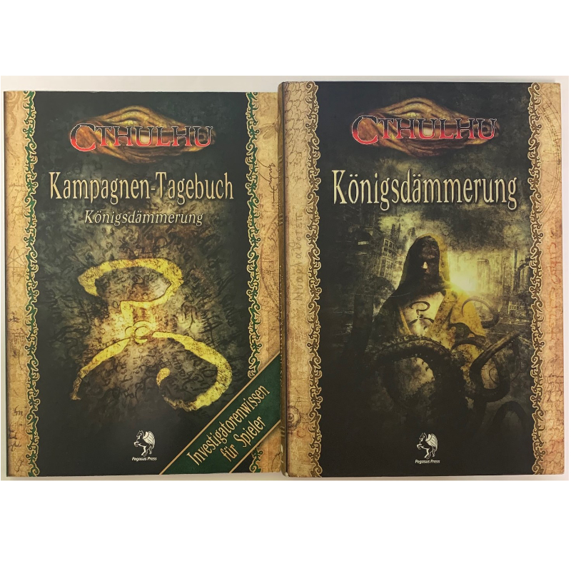 Wir bieten hier für das Rollenspiel Cthulhu von PEGASUS Spiele den vergriffenen Abenteuerband Königsdämmerung von 2016 sowie das umfangreiche Kampagnen-Tagebuch an.