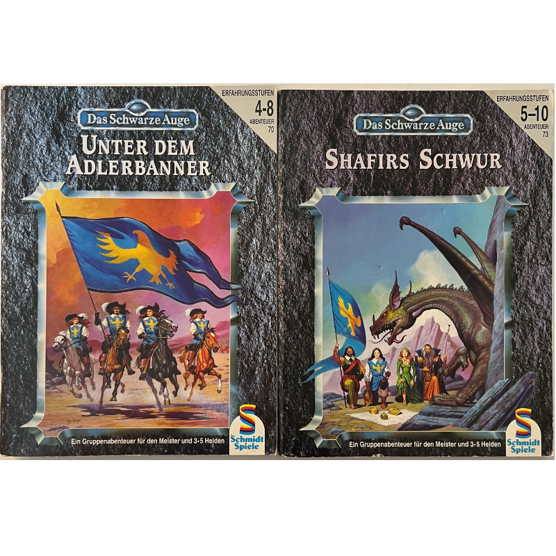 Wir bieten hier die Gruppen-Abenteuer 70 Unter dem Adlerbanner und 73 Shafirs Schwur an. Zusammen bilden sie die zweibändige Aarenstein-Kampagne.