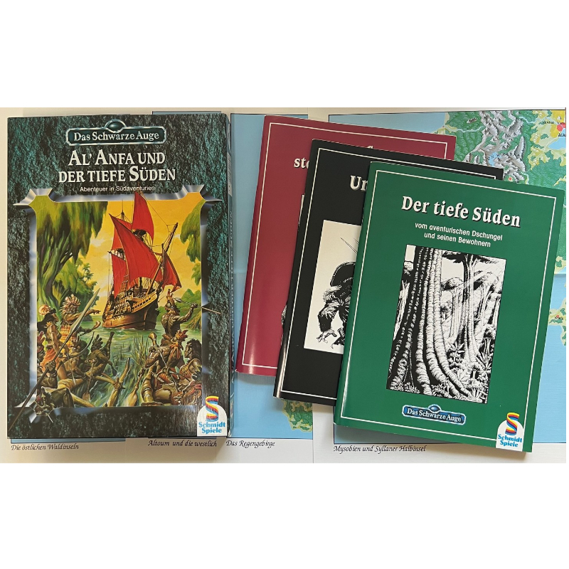 Wir bieten hier für das Rollenspielsystem Das Schwarze Auge von Schmidt-Spiele die Regionalbox Al‘ Anfa und der tiefe Süden an in der ersten Version von Schmidt Spiele aus dem Jahr 1994 (die Box wurde nach der Übernahme der DSA-Lizenz durch FanPro 1999 neu aufgelegt; inhaltlich identisch).