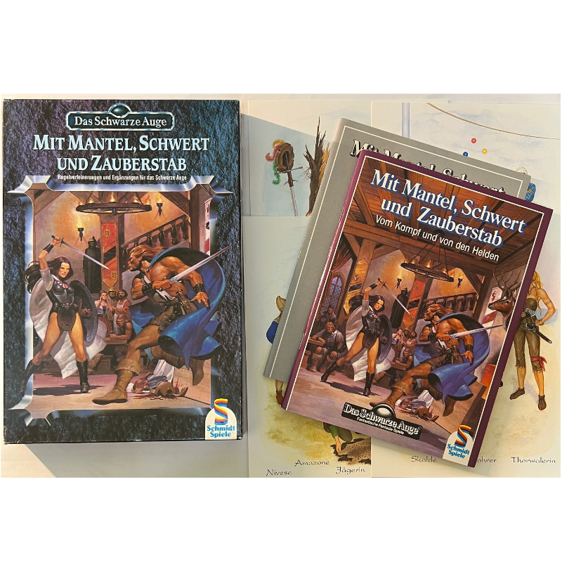 Für das Fantasy-Rollenspiel Das Schwarze Auge erschien 1992 erstmalig die Ergänzung Mit Mantel, Schwert und Zauberstab. Diese Box mit der bekannten Wirtshausschlacht als Covermotiv erschien in drei Varianten: Die Erstauflage von Schmidt Spiele mit komplettem Cover-Bild und eine Neuauflage ebenfalls von Schmidt Spiele; diese aber mit dem von Abenteuern bekannten dunklem Rahmen. Zuletzt erschien die Fan-Pro-Version. Der Inhalt ist stets gleich.