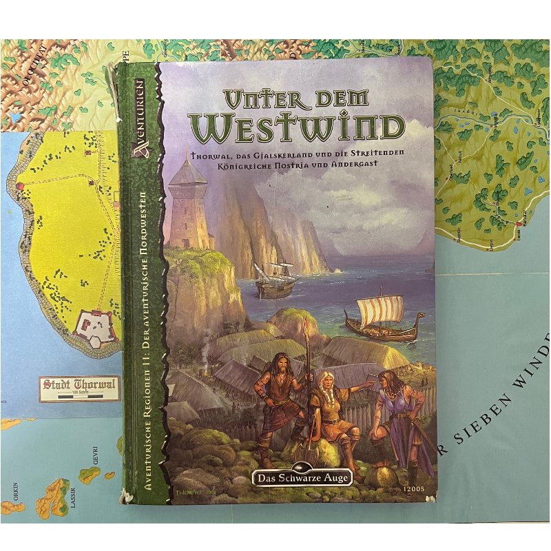 Wir bieten hier für das Fantasy-Rollenspiel Das Schwarze Auge von FANPRO den vergriffenen Hardcoverband Unter dem Westwind Aventurische Regionen 2 – Der aventurische Nordwesten an. Regeltechnisch orientiert sich der Band an der vierten Regelversion (DSA4). Der Band erschien erstmalig 2004; mehrere Auflagen folgten. Wir bieten hier die Erstauflage 2004 an.