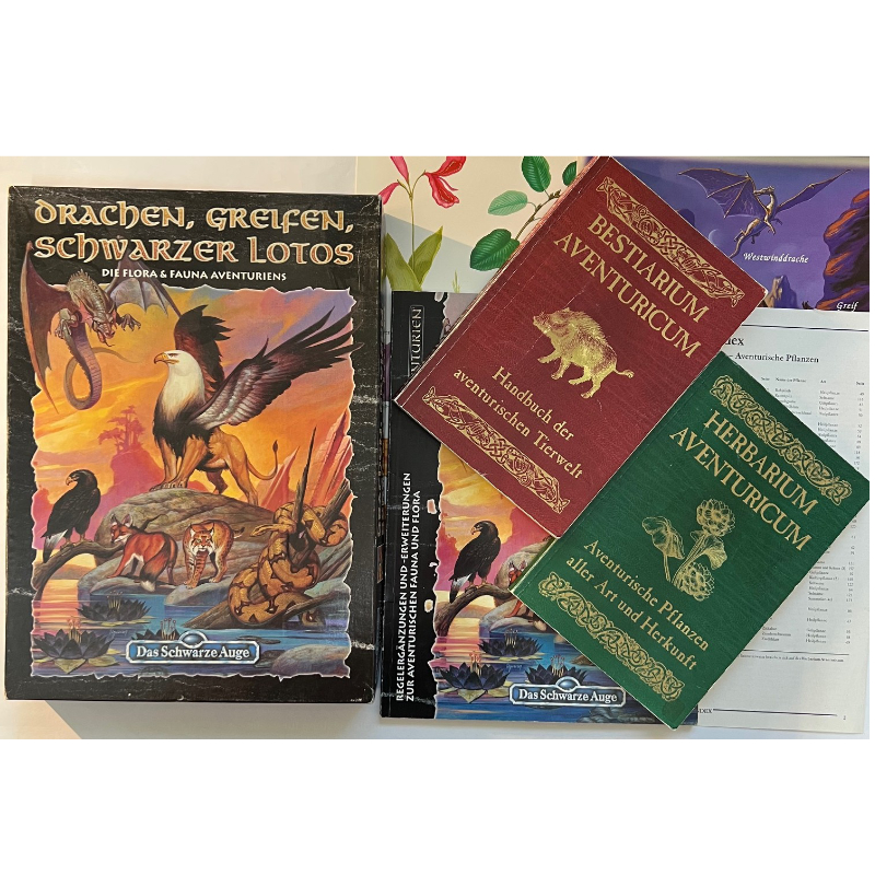 Die Spielhilfe ‚Drache, Greifen, Schwarzer Lotos‘ präsentiert die reichhaltige Tier- und Pflanzenwelt Aventuriens und stellt Meistern wie Spielern viele Ergänzungs- und Erweiterungsregeln zur Verfügung, um Abenteuer in der Wildnis zu einem unvergesslichen Spieleerlebnis werden zu lassen.