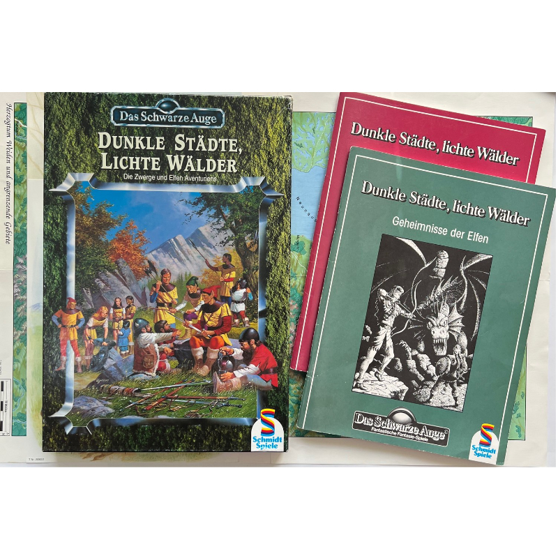 Im Mai 1993 erschien für das Fantasy-Rollenspiel Das Schwarze Auge bei Schmidt Spiele in der Reihe der Regelmodule die Box Dunkle Städte, lichte Wälder – Die Zwerge und Elfen Aventuriens. Von dieser Box existieren zwei Versionen: Schmidt Spiele veröffentlichte zuerst eine Box und nach der Übernahme und Weiterführung des Schwarzen Auges durch FanPro erschien diese Box 1999 und die darin enthaltenen Bände mit anderem Cover, aber sonst mit unverändertem Inhalt. Wir bieten Ihnen hier Schmidt-Version an.
