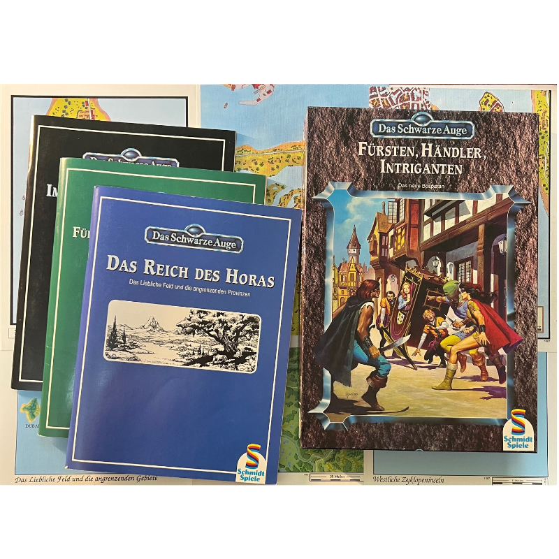 Wir bieten Ihnen hier aus der dritten Regelversion die vergriffene Regionalbox Fürsten, Händler, Intriganten von Schmidt-Spiele aus dem Jahr 1996 an (eine gleichnamige Box veröffentlichte nach Lizenzübernahme FanPro 1999 mit geändertem Format und Layout; inhaltlich sind sie identisch).